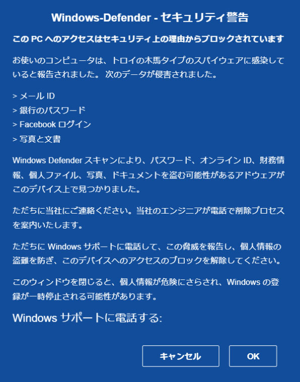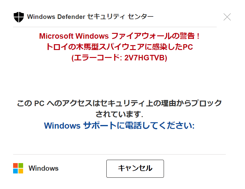 この PC へのアクセスはセキュリティ上の理由からブロックされています。 この PC にアクセスしたり再起動したりしないでく さい。 この基本的な警告を見落とすと、このフレー ワークに関する情 が失われる可能性があります。 できる け早くサポートに連絡してく さい。Microsoft の専門家が電話で調査を案内します。 このアプリケーションを実行すると、PC が危険にさらされる可能性があります。 Windows サポート: (日本フリーダイヤル)